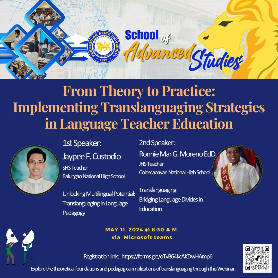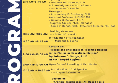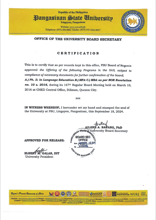 The Doctor of Philosophy in Language Education – English offered by the School of Advanced Studies of Pangasinan State University is a terminal academic program designed to produce highly competent, research-oriented, and globally attuned leaders in English language education. Anchored in CHED Memorandum Order No. 15, s. 2019 and aligned with the imperatives of Education 4.0, the program fosters the highest level of expertise in the field through a balanced integration of advanced theoretical knowledge, innovative pedagogical practice, and rigorous scholarly inquiry.