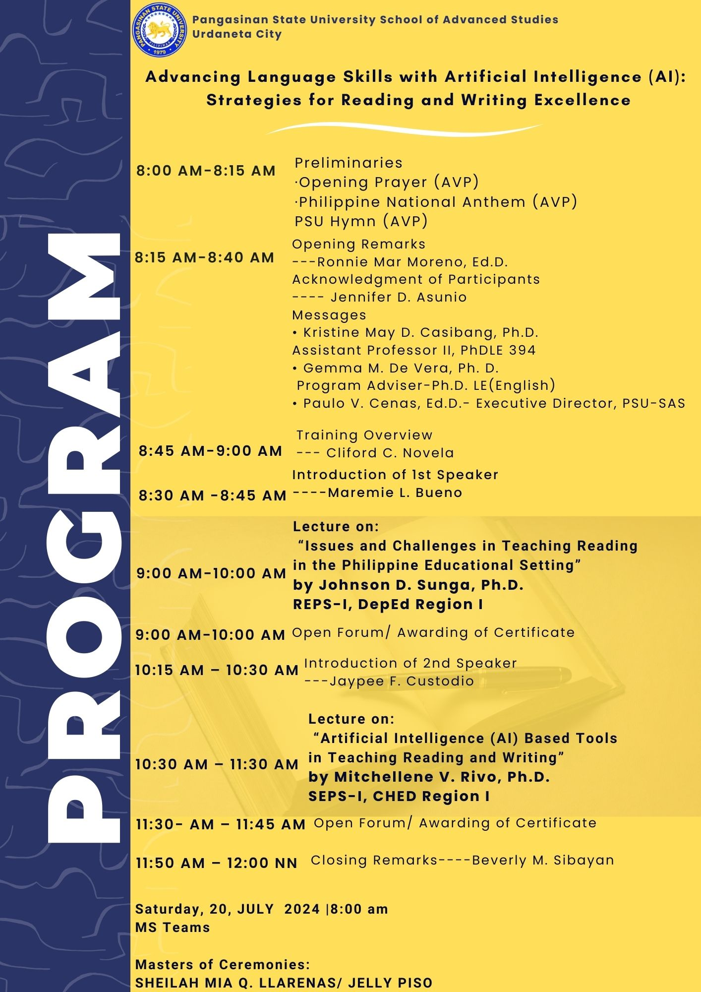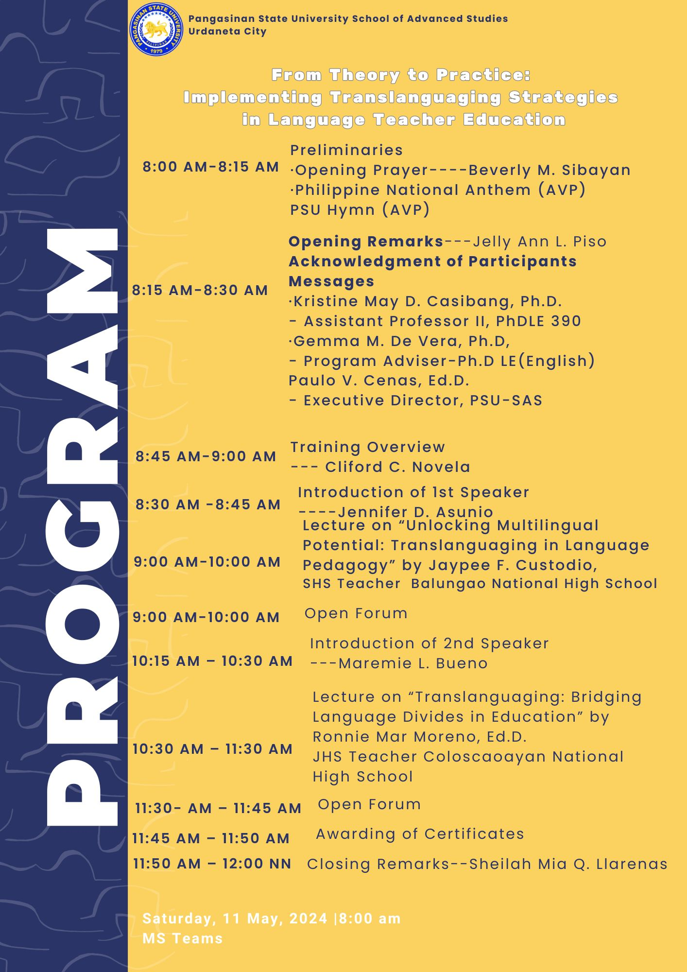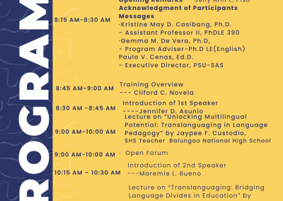 It is my honor to warmly welcome you all to the Doctor of Philosophy in Language Education – English program. Today marks the beginning of a rigorous yet rewarding journey of scholarly exploration, critical inquiry, and professional growth.